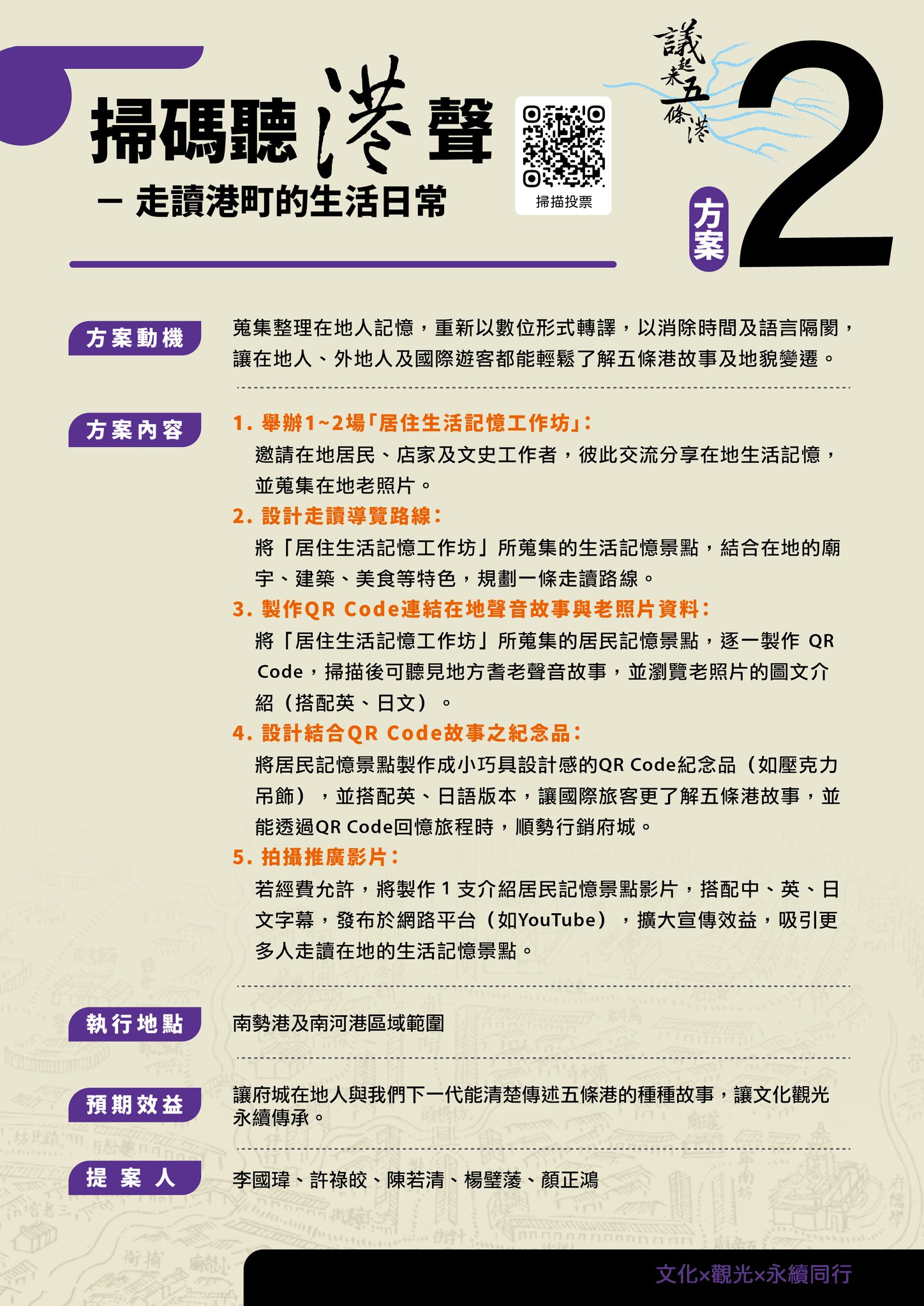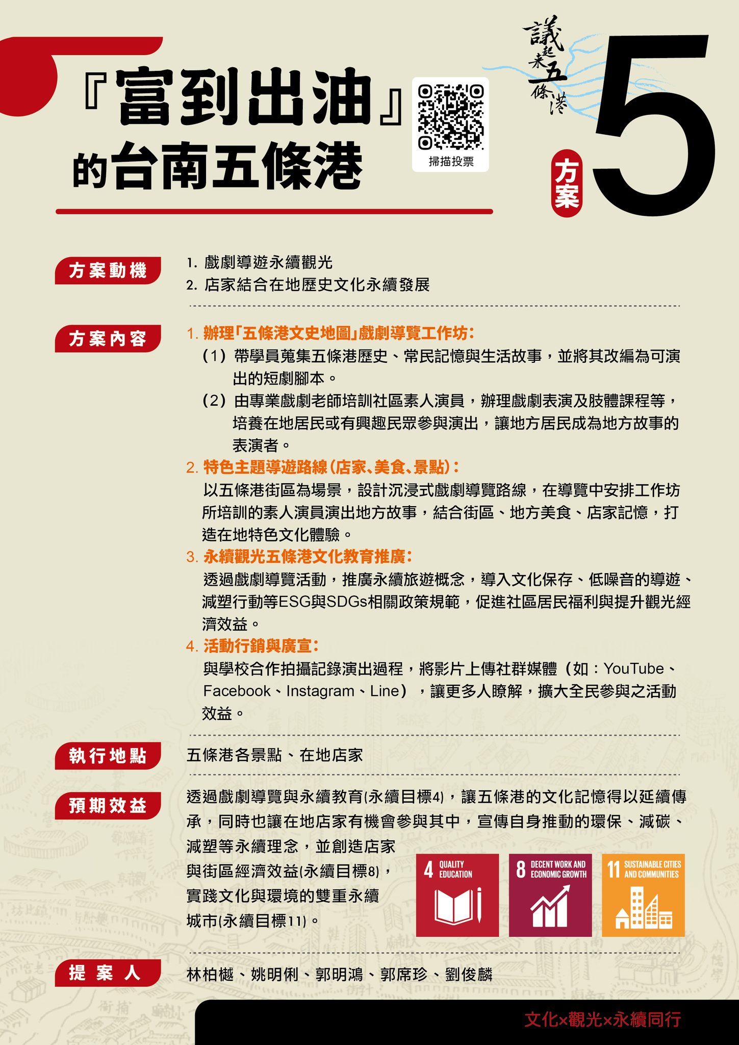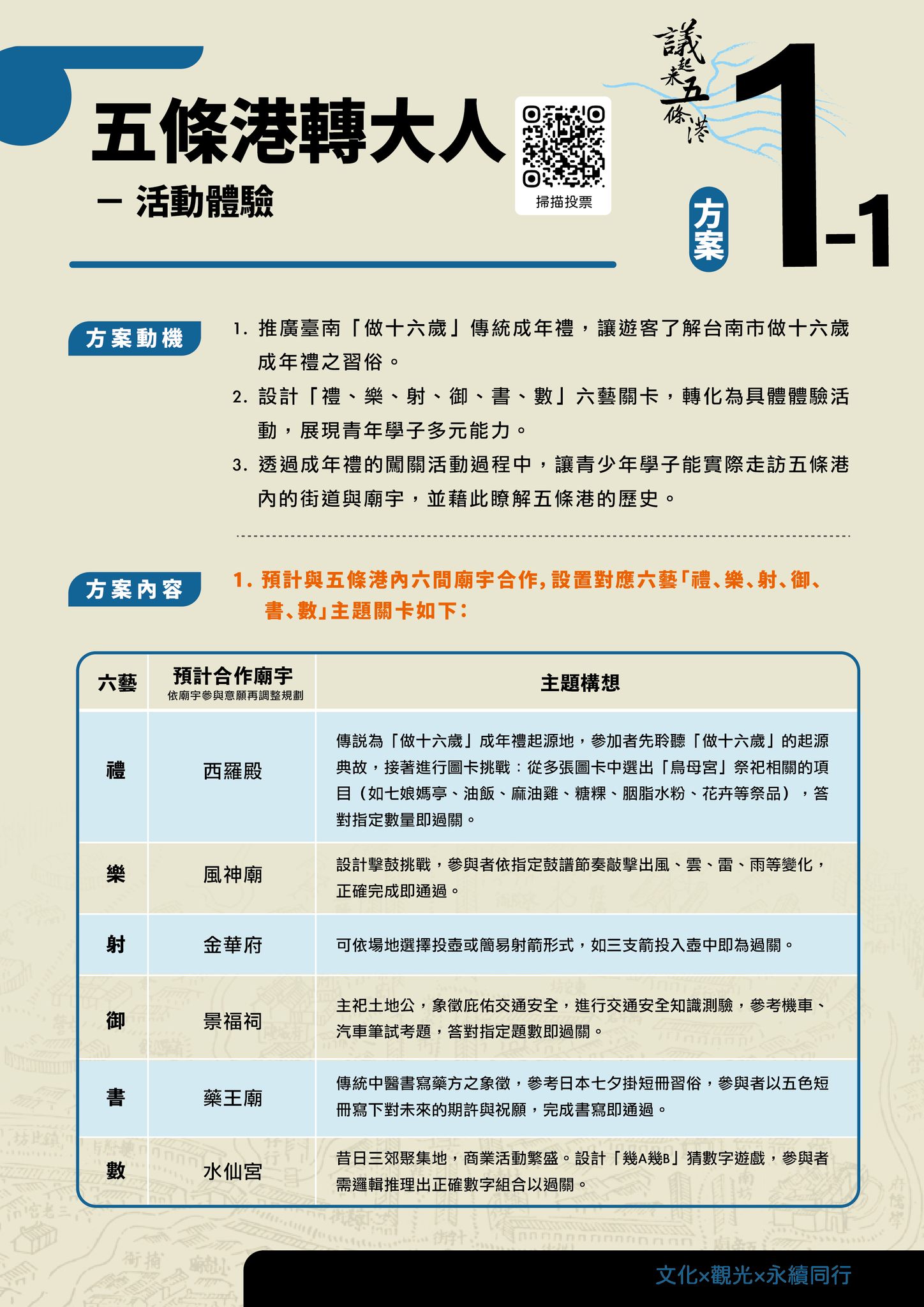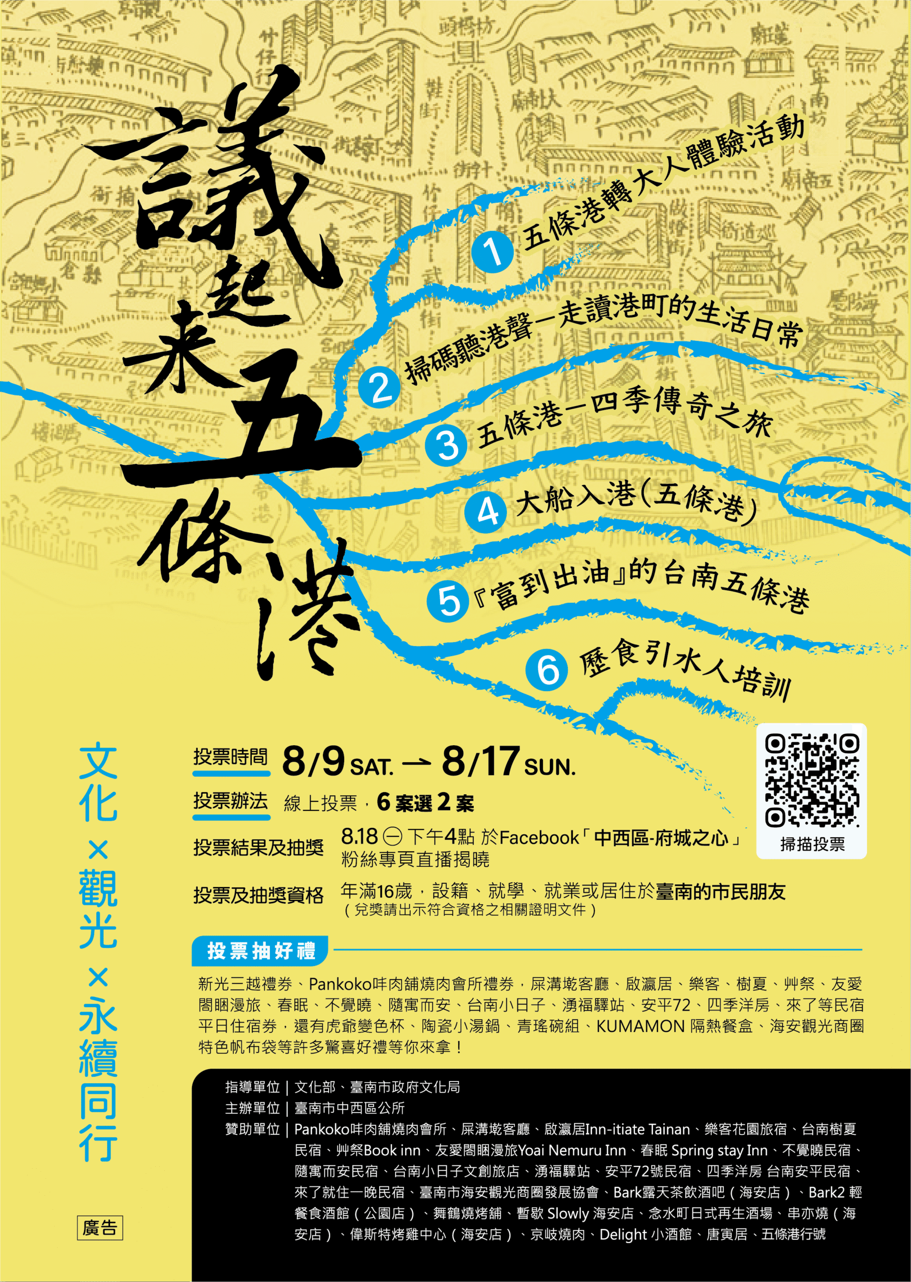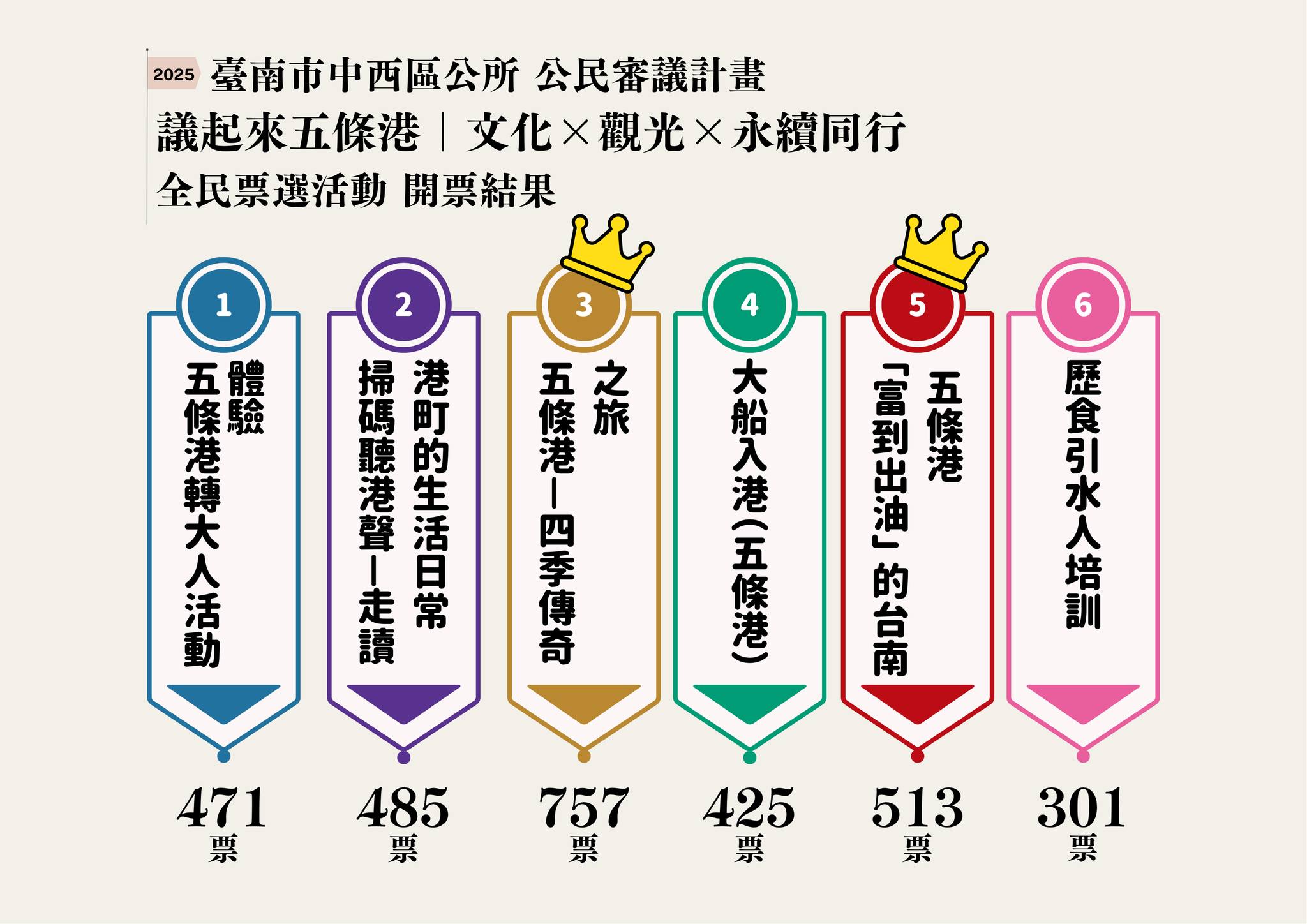 2025, 議起來五條港|文化 × 觀光 × 永續同行 議起來五條港|文化 × 觀光 × 永續同行(2025) 將「公民審議」接軌聯合國「永續發展目標(SDGs)」,從文化觀光與在地生活出發,思考五條港如何邁向「共好、共生、共榮」的未來,並深化公民參與,促進居民共同討論地方文化與觀光發展,凝聚在地認同與社區共識。 經公民提案大會初選產生的6個候選方案,並經提案工作坊強化各方案的可行性,8/18投票結果出爐,共計投出3,010票,最高票數的兩案,分別為:【五條港-四季傳奇之旅】757 票、【「富到出油」的台南五條港】513 票,兩案將正式列入後續社區營造計畫執行。 Vtuber「咪奈咪」vs. 中西區在地傳統產業職人