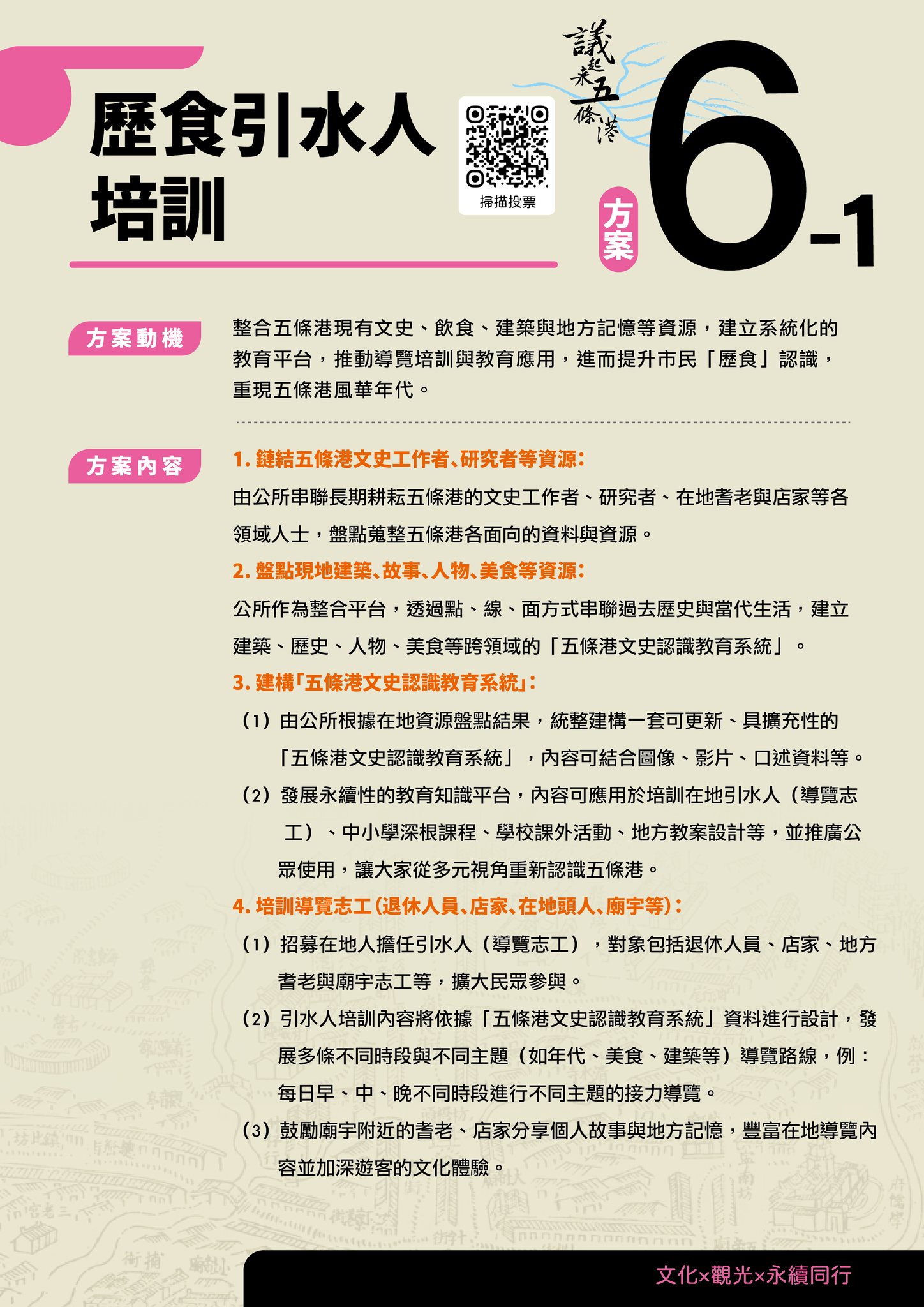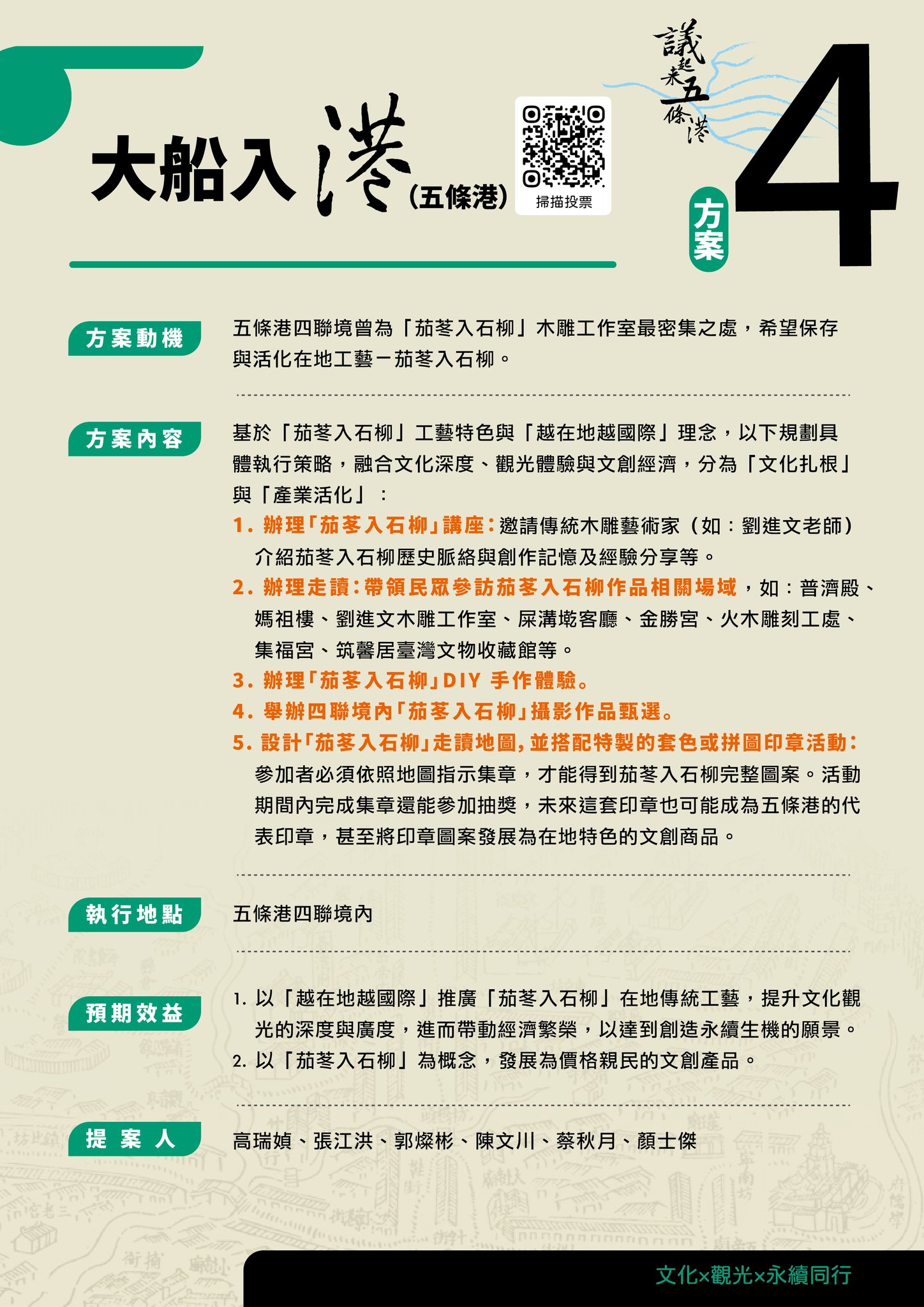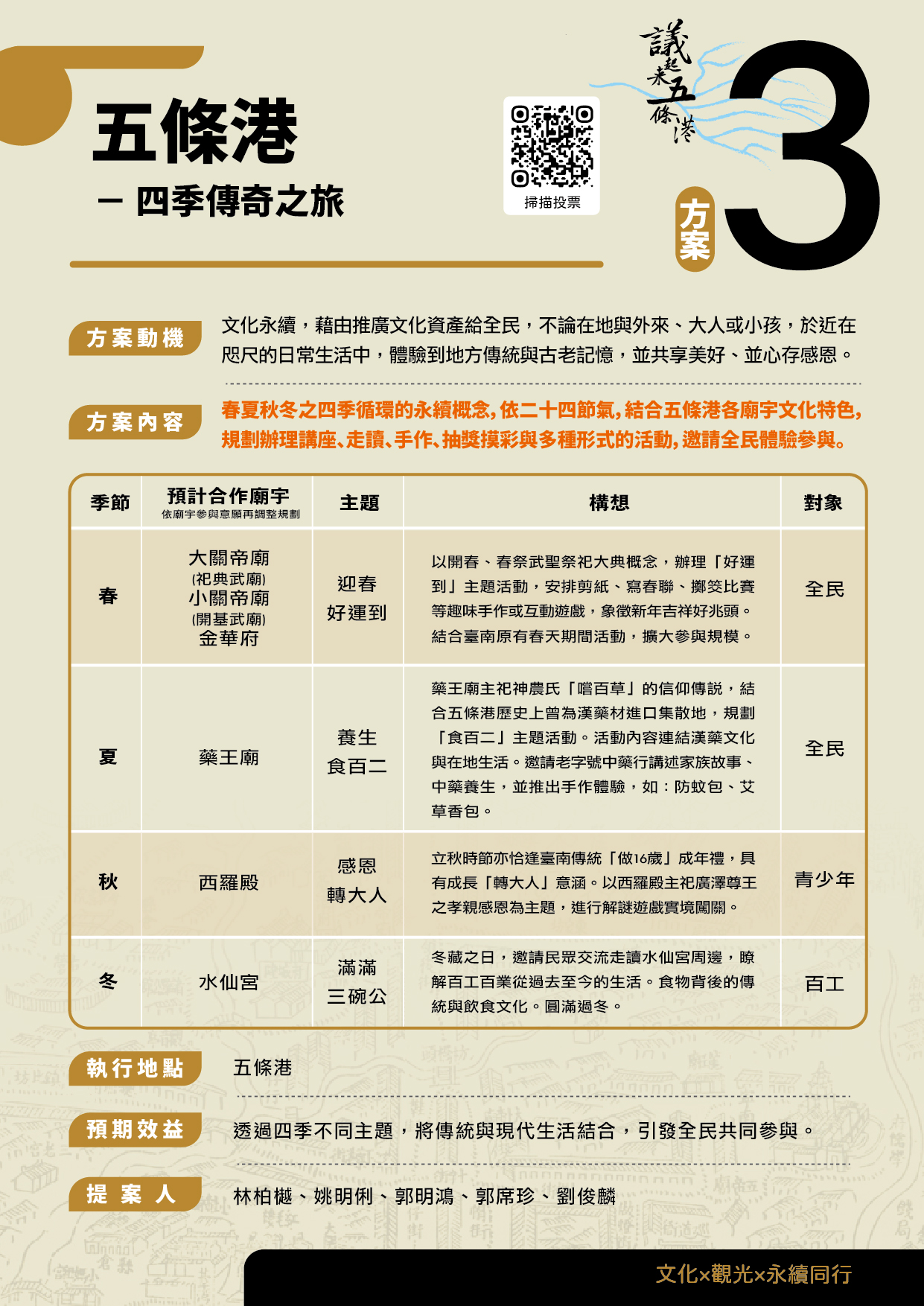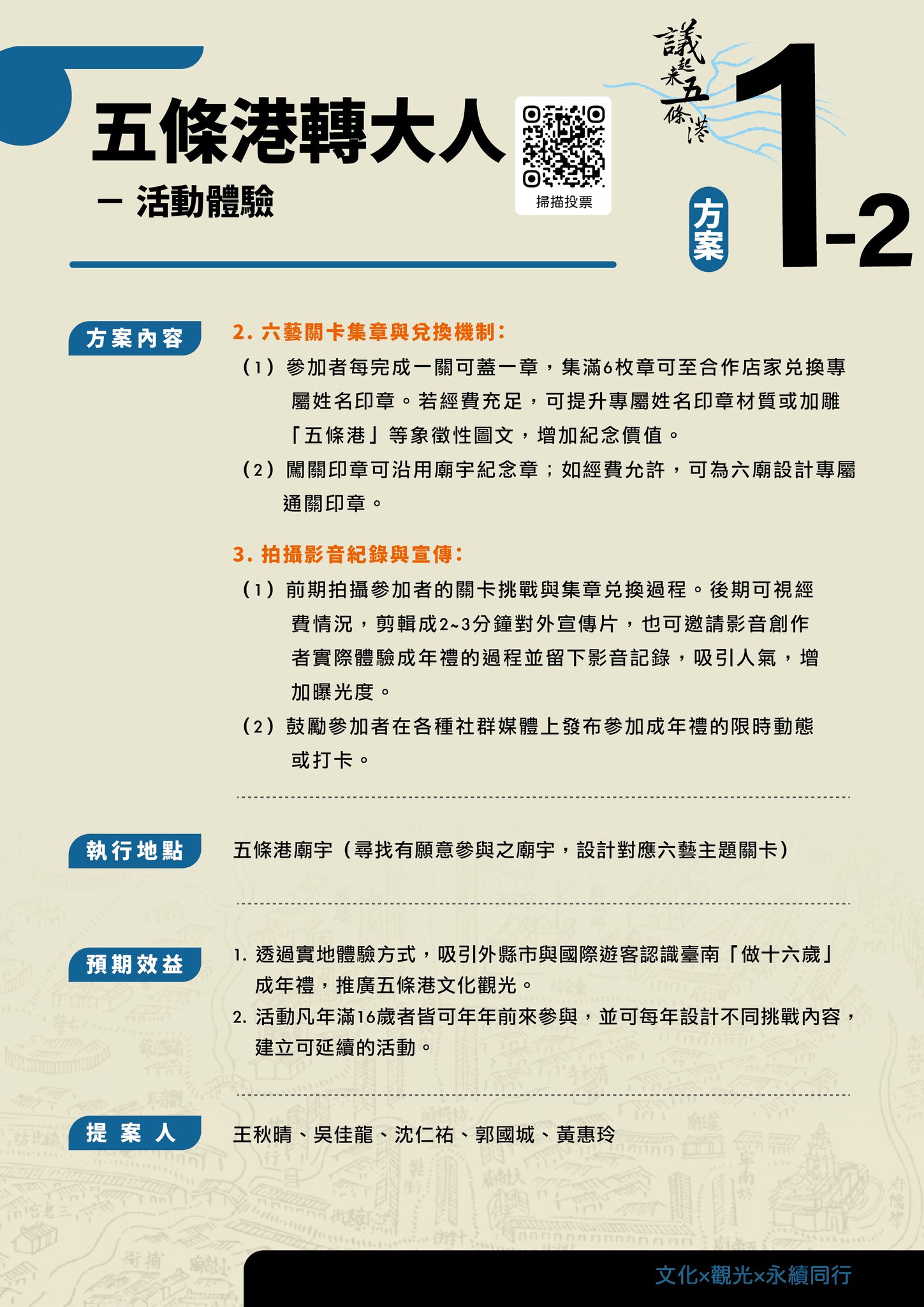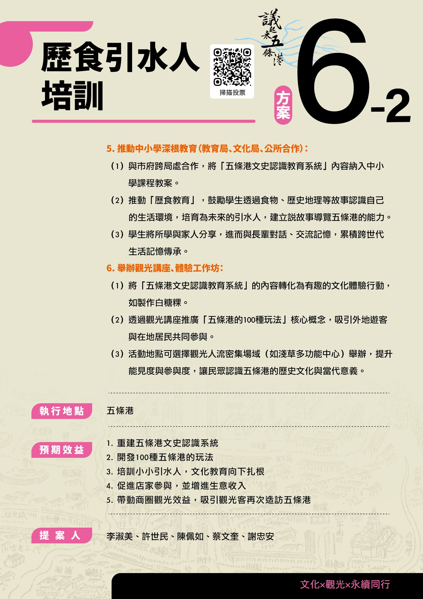 2025, 議起來五條港|文化 × 觀光 × 永續同行 議起來五條港|文化 × 觀光 × 永續同行(2025) 將「公民審議」接軌聯合國「永續發展目標(SDGs)」,從文化觀光與在地生活出發,思考五條港如何邁向「共好、共生、共榮」的未來,並深化公民參與,促進居民共同討論地方文化與觀光發展,凝聚在地認同與社區共識。 經公民提案大會初選產生的6個候選方案,並經提案工作坊強化各方案的可行性,8/18投票結果出爐,共計投出3,010票,最高票數的兩案,分別為:【五條港-四季傳奇之旅】757 票、【「富到出油」的台南五條港】513 票,兩案將正式列入後續社區營造計畫執行。 Vtuber「咪奈咪」vs. 中西區在地傳統產業職人