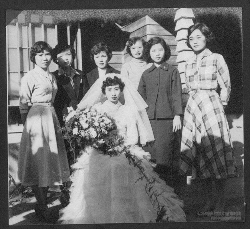 母親的閨密,蔡素蘭阿姨結婚上禮車前跟伴娘群的合影,後排左2是我母親,兩位友誼70多年迄今永存。